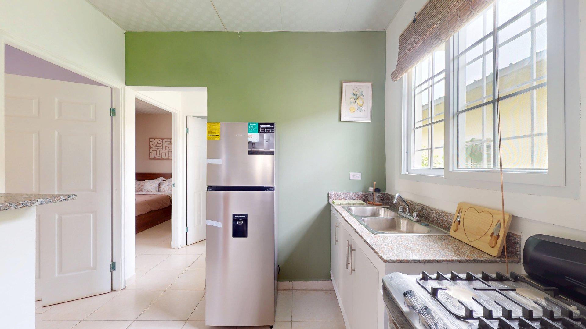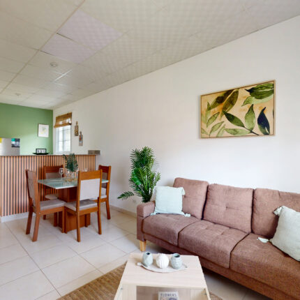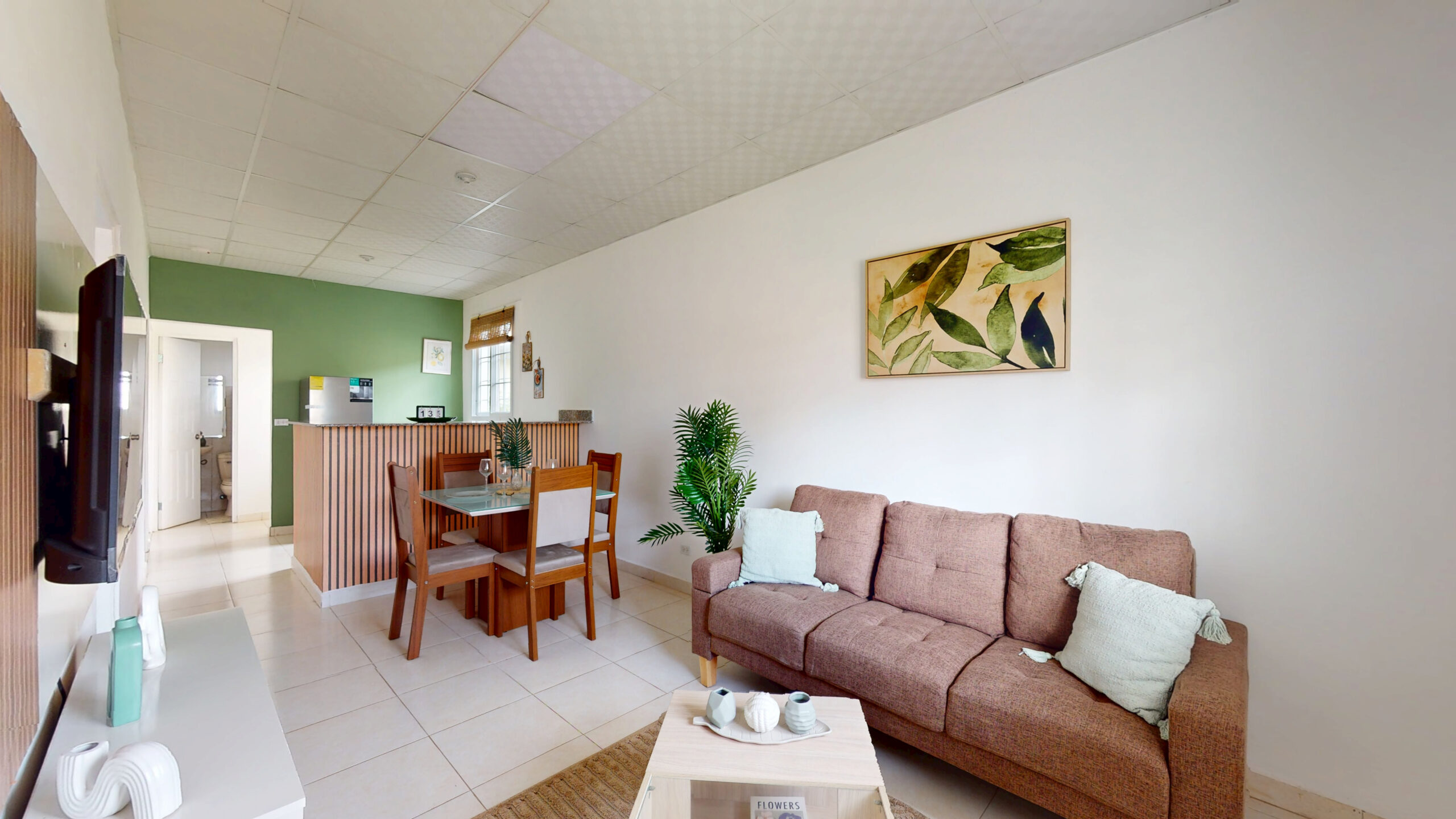 Sala-comedor y cocina. Piso de cerámica, cielo raso suspendido.